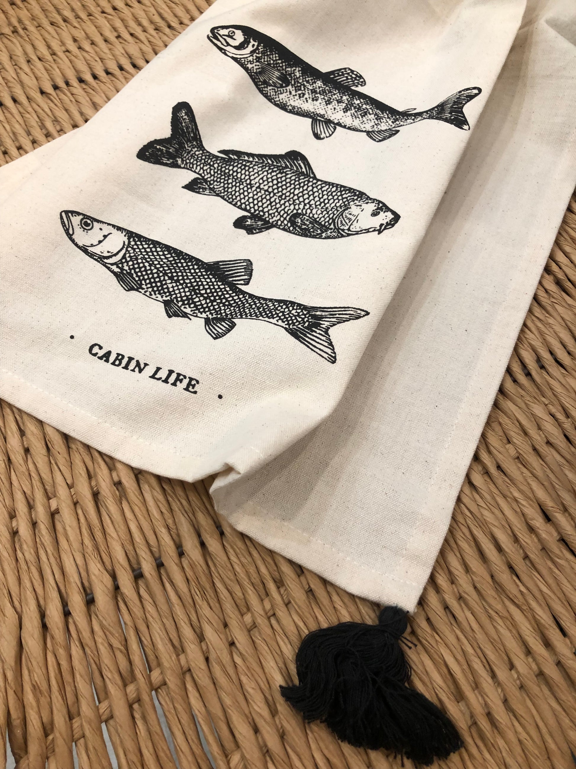 Attractive 100% cotton tasseled tea towel with fish motif.