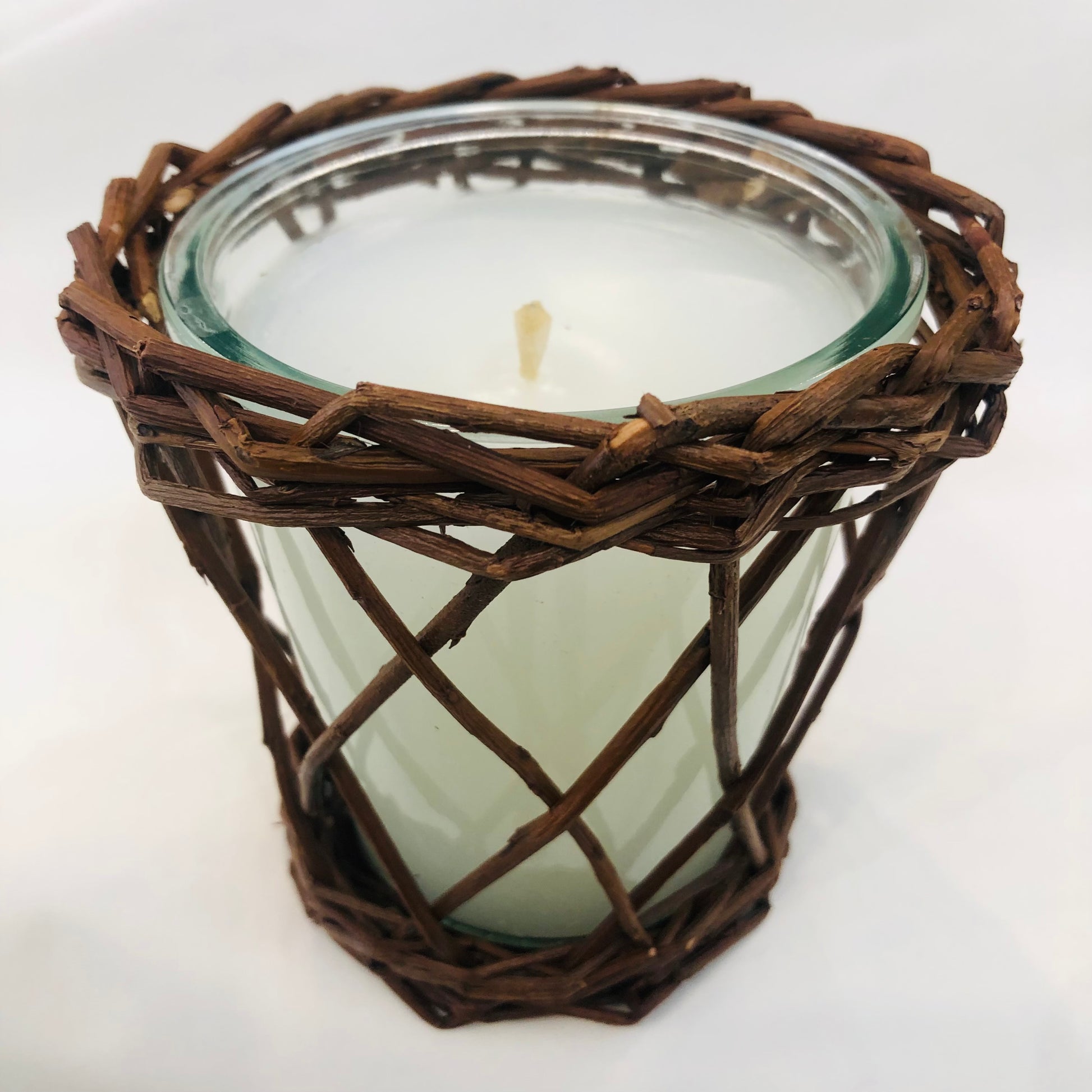 Juicy red apples and buttery caramel mix with cinnamon and applewood in this scented candle in glass with wicker carrier