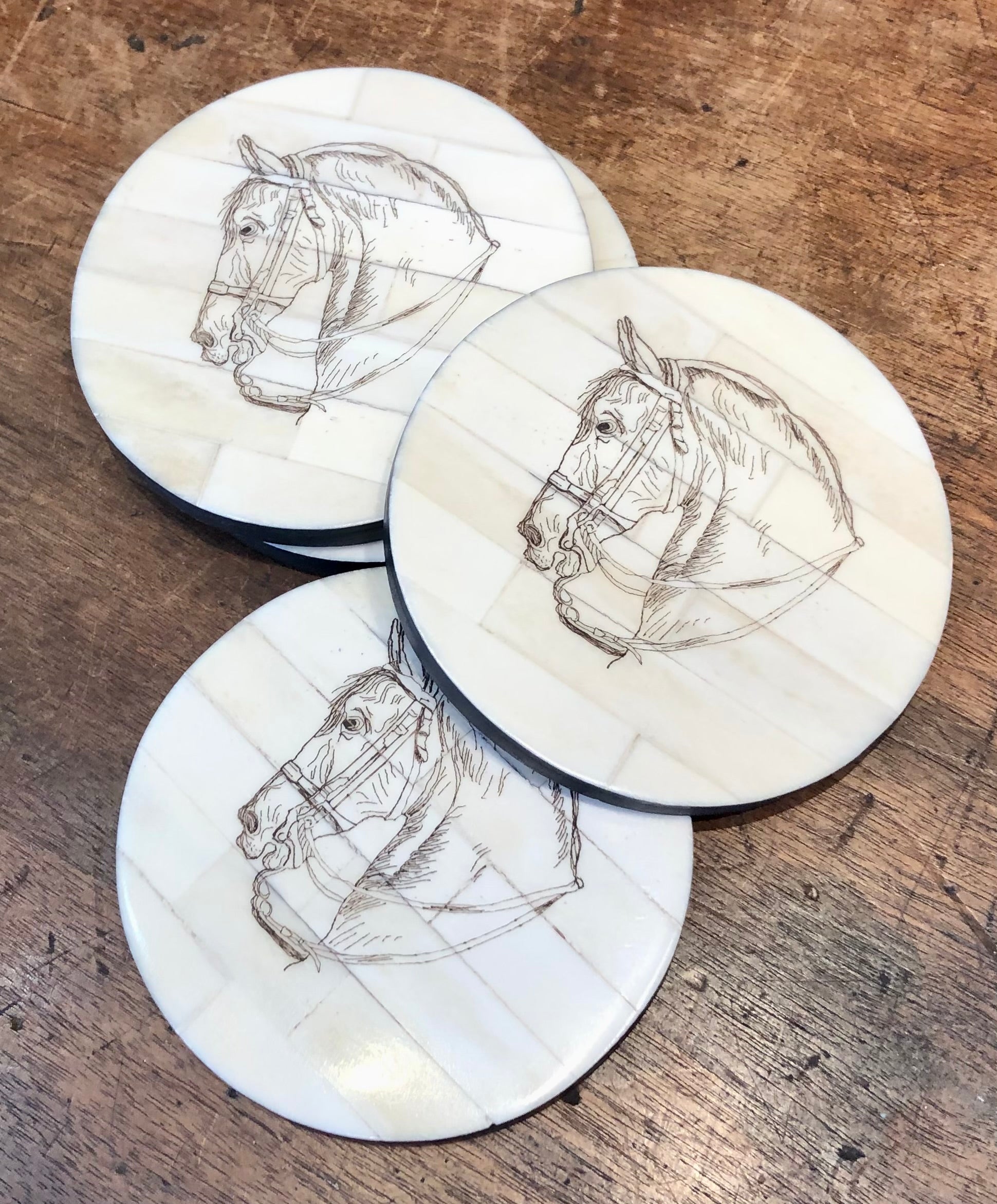 Horse Head Scrimshaw Bone Coasters/Set of 4