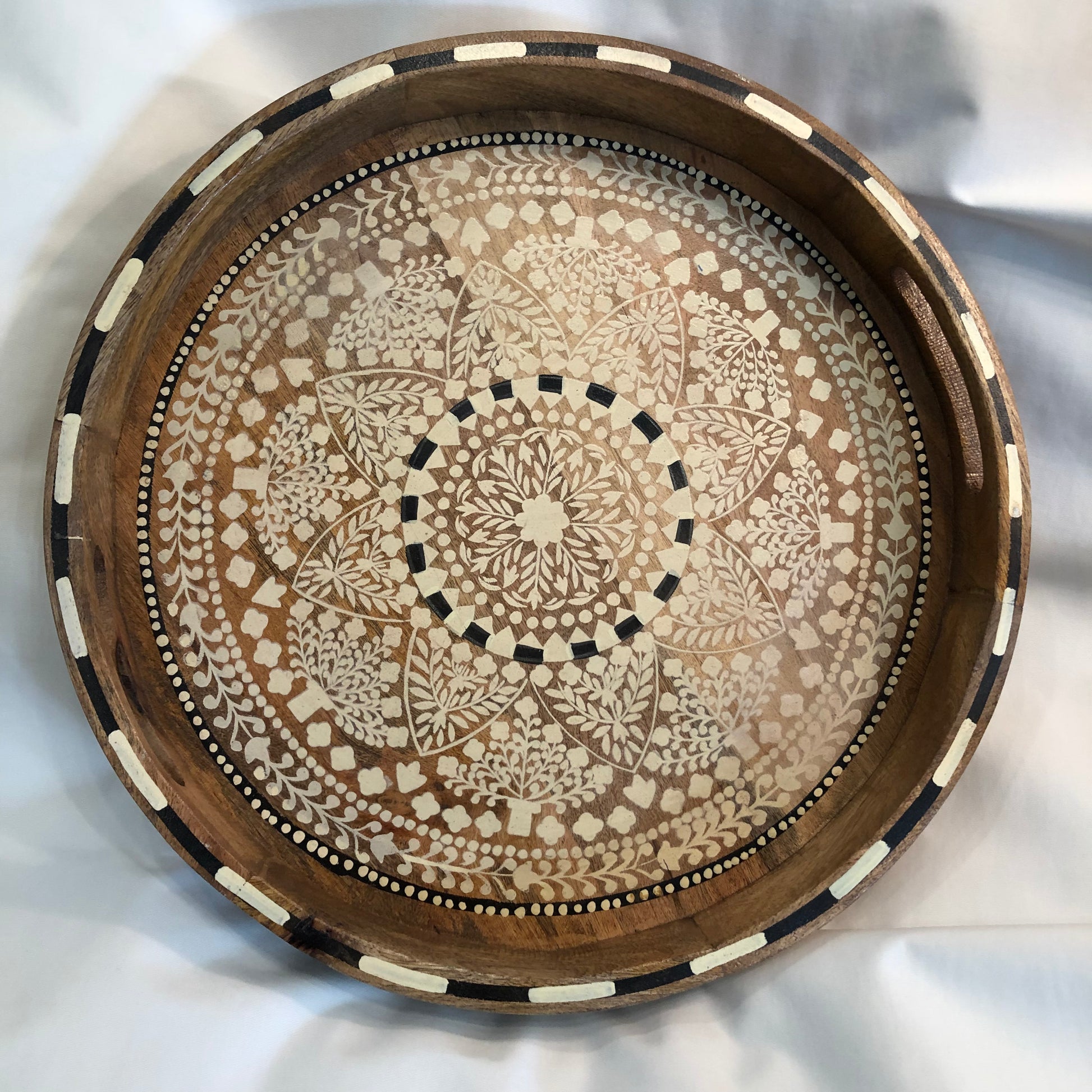 Beautifully decorated mandala design on Mango wood. Cut out handles make serving easy.