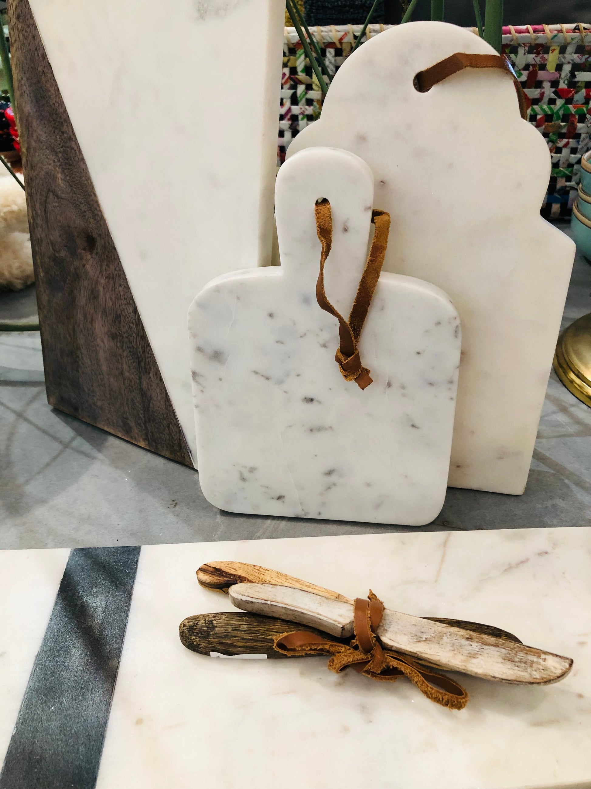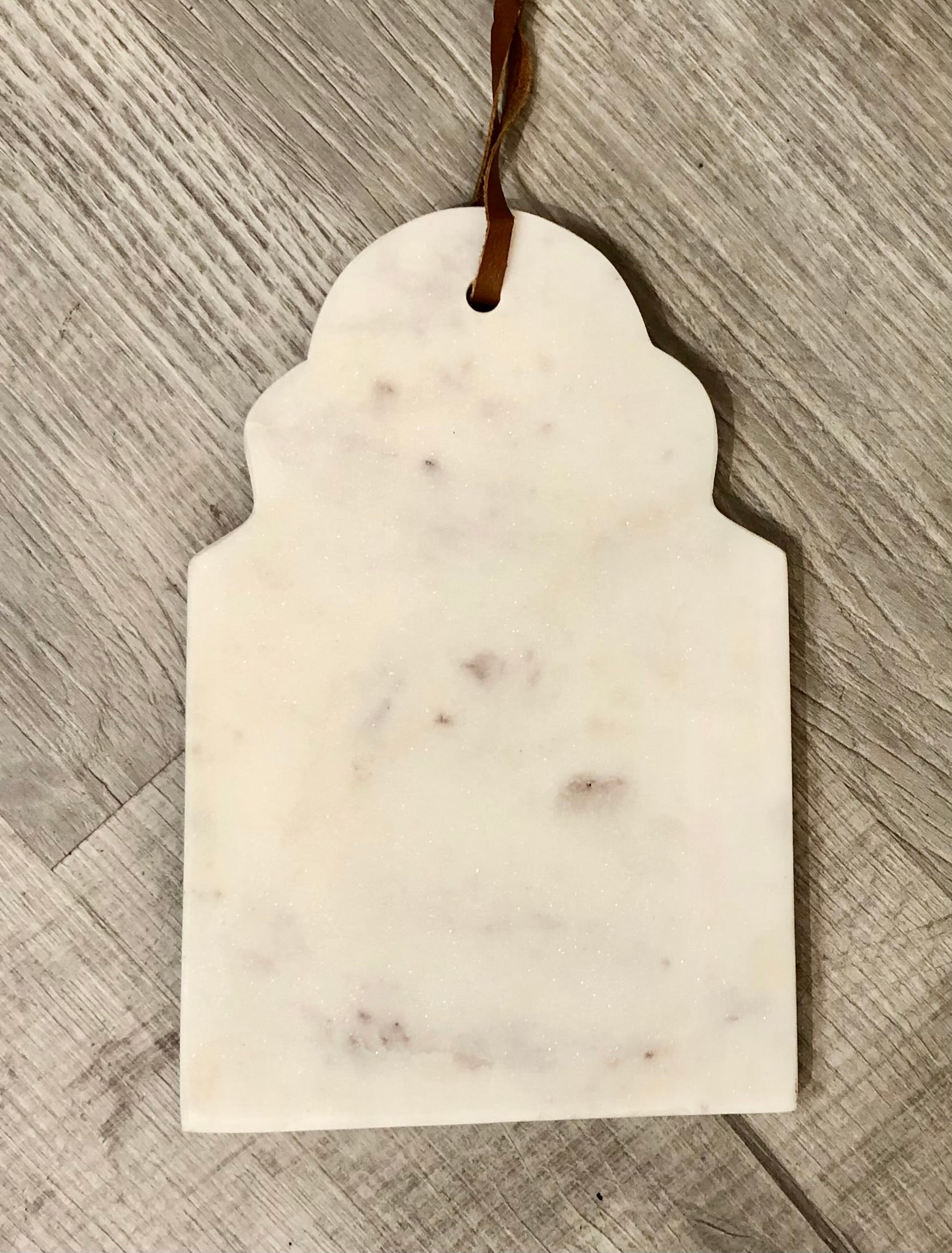 Charming marble cheese/cutting board with leather hanger. Pair with our larger boards or wooden cheese knives.