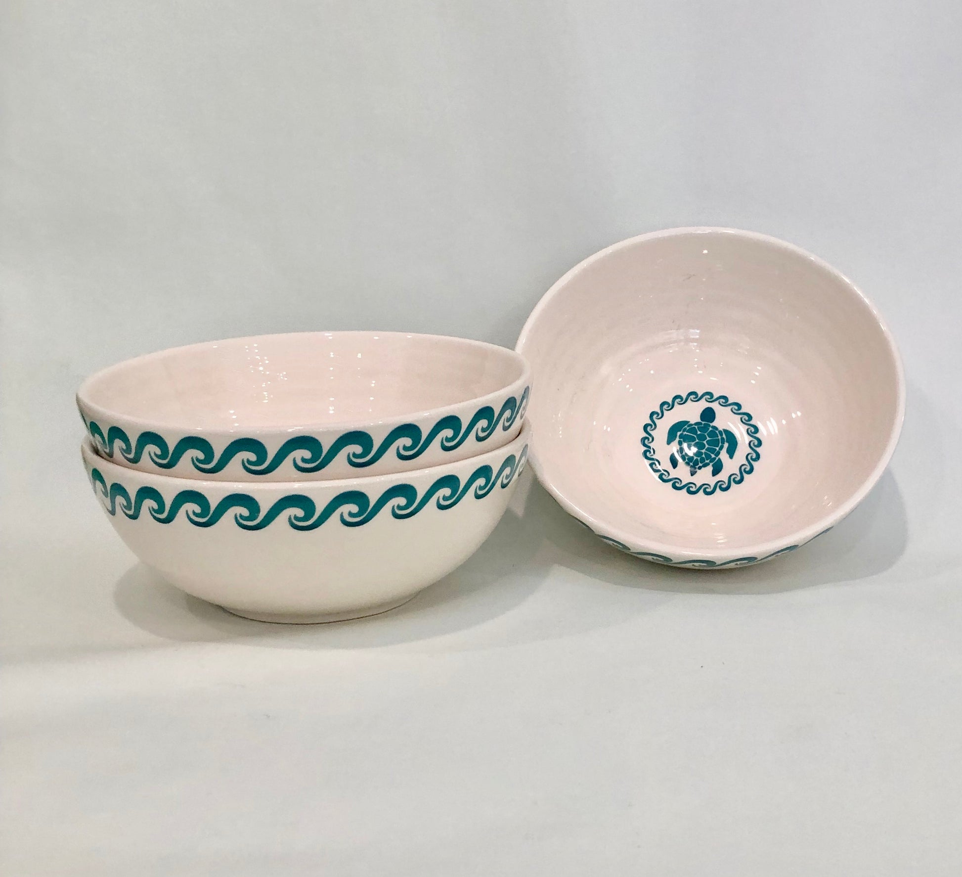 Charming salad or soup bowl with turquoise wave border and sea turtle center