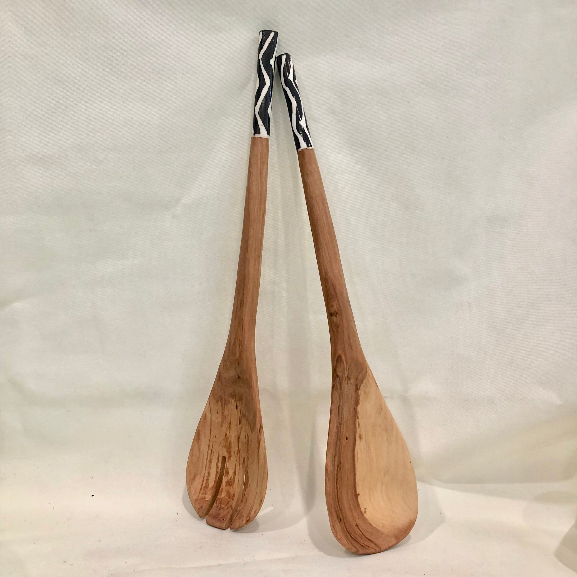 Wood Salad Servers with Black and White Bone Detail